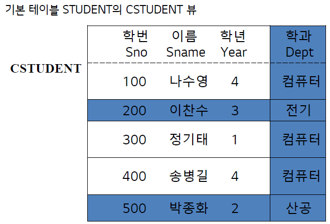 create view cstudents (sno, sname , year) as select sno,sname,year from students where dept = '컴퓨터' with check option;