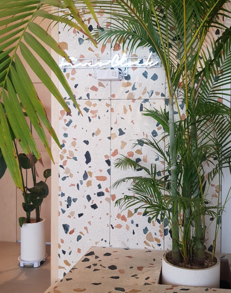 1층 까페 입구. 바닷가까페라서 그런지 야자수가 곳곳에 있다.