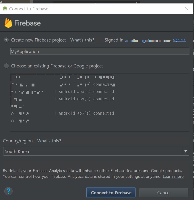 4) Connect your app to Firebase 를하면 아래와 같은화면이 나오고, 'Connect to Firebase'를 눌러줍니다.