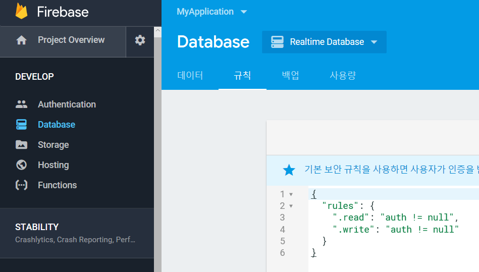 Firebase의 MyApplication > RealtimeDatabase에 들어가 규칙을 변경시켜 줍니다.