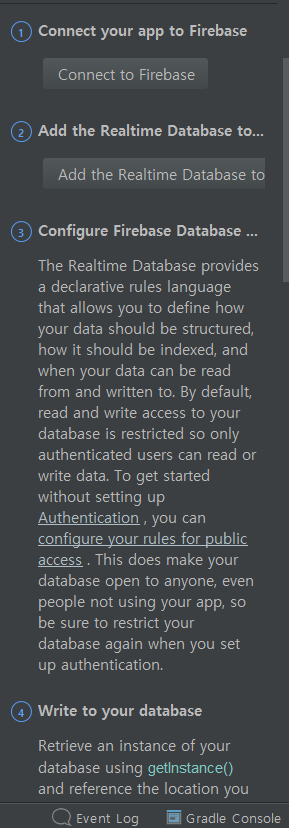 'Add the Realtime Database to your app' 버튼을 클릭하고 적용시킵니다.