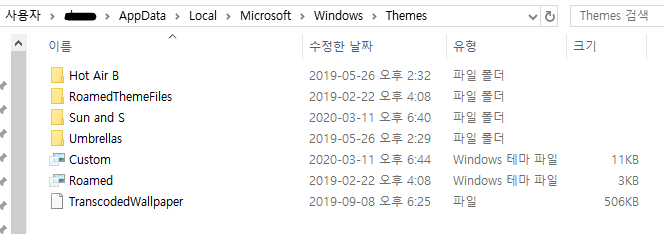 파일경로 : C드라이브 > Users > 사용자이름> AppData > Local > Microsoft > Windows > Themes