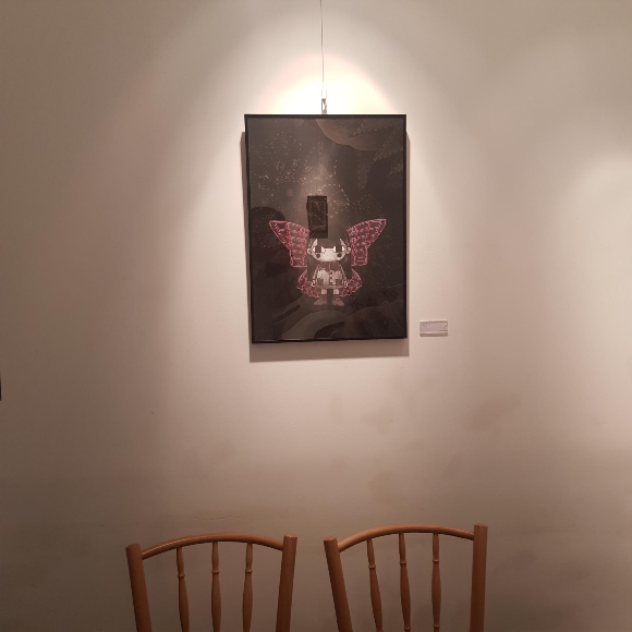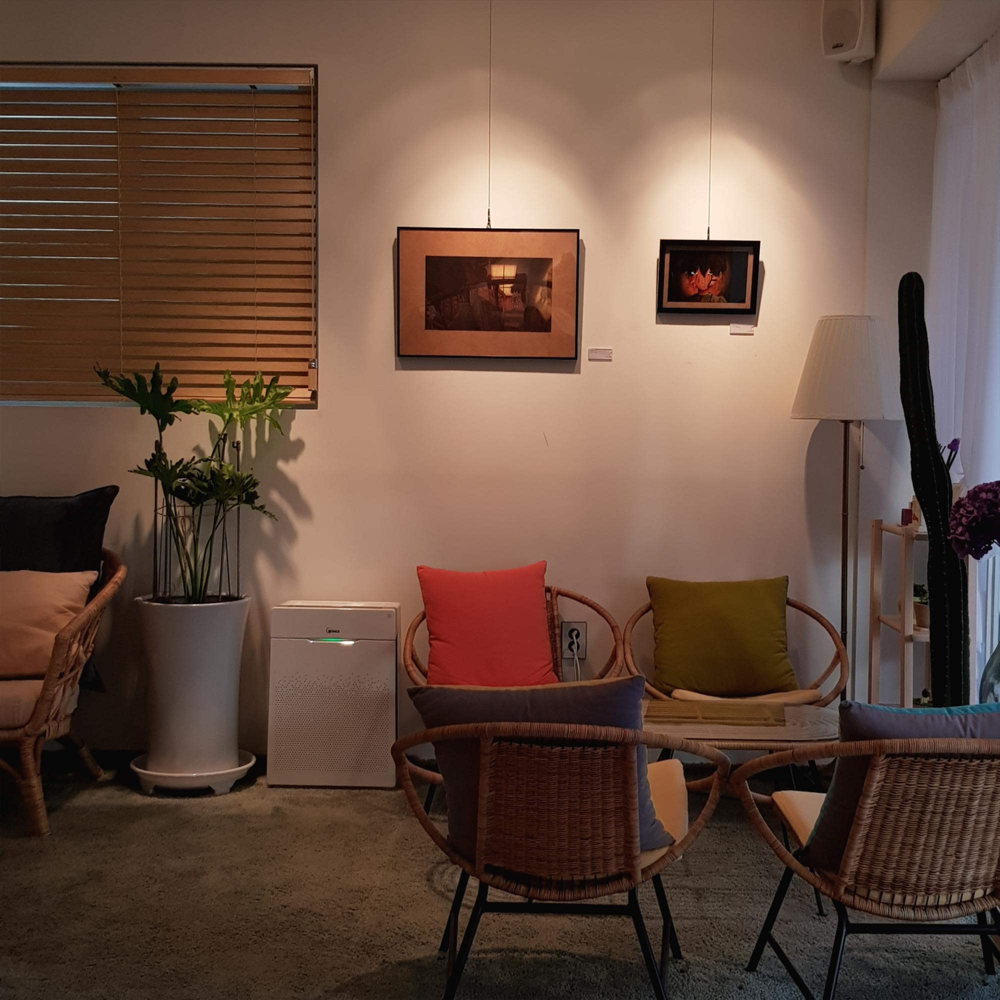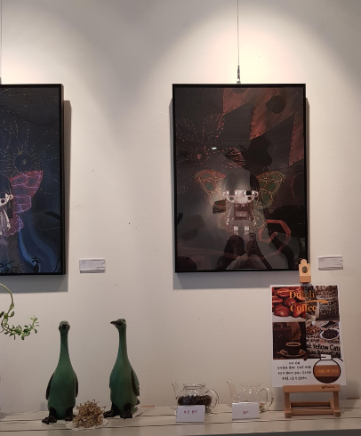 자칫하면 부조화스럽기 마련인데, 그림이 일관성 있어서 까페 분위기와 조화롭게 어울렸다.