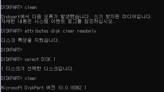 이경우, 아래의 명령어로 읽기 전용 상태를 해제한 후 clear하면 문제가 해결됩니다.
