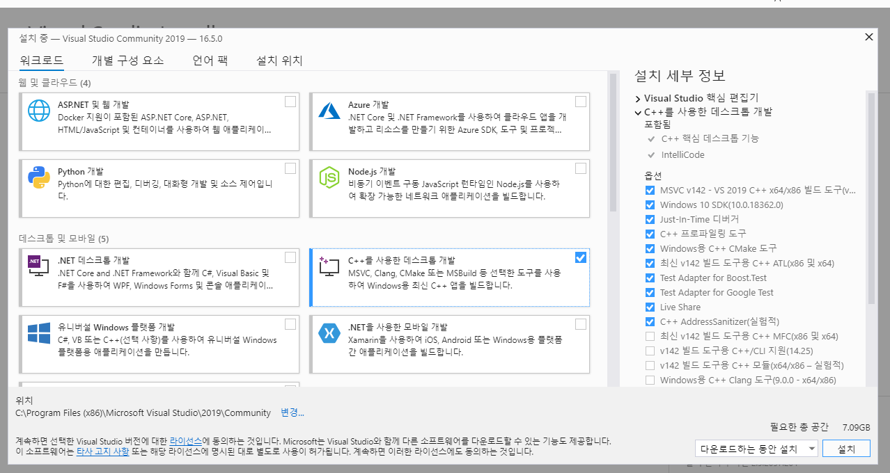 > 기본 C++ 개발도구가 포함되어있는 워크로드입니다. C와 C++을 사용할 예정이라면 'C++을 사용한 데스크톱 개발'에 체크합니다.