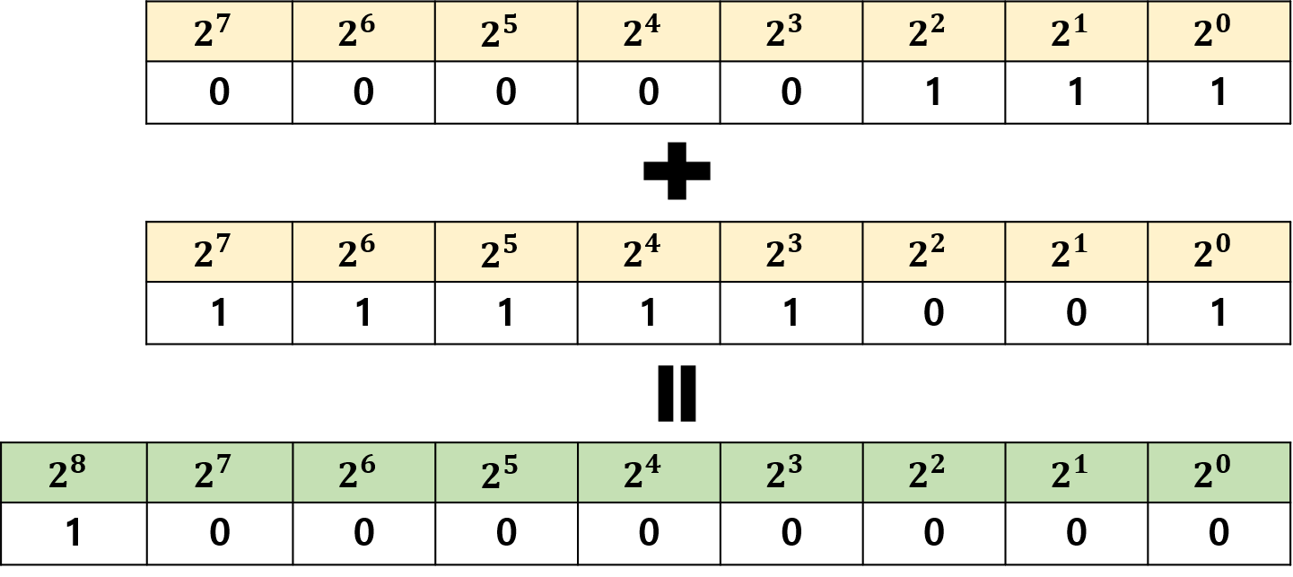 우리가 구한 7에 대한 이진수 00000111(2) 와 111111001(2)를 더해봅니다.