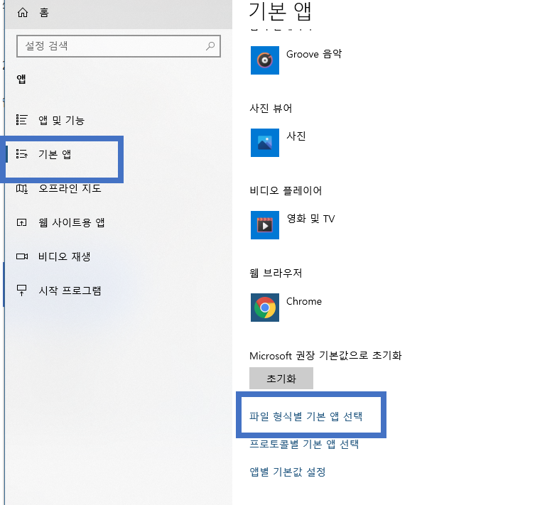 앱에서 '기본 앱' 속성에 들어갑니다. 그리고 '파일 형식별 기본 앱 선택' 을 클릭합니다.