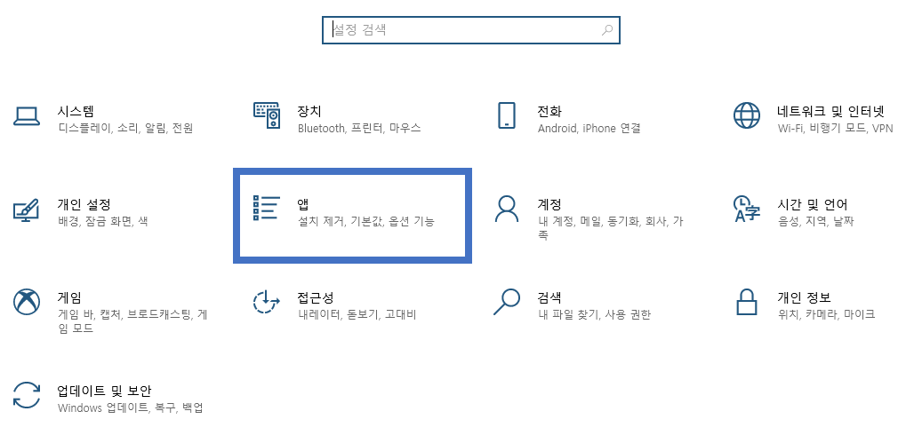 설정을 켜서 앱 속성(설치 제거, 기본값, 옵션기능)에 들어갑니다.