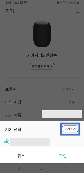 현재 저는 기가지니2를 연결중입니다. 그럼 기기를 추가해보도록 하겠습니다.