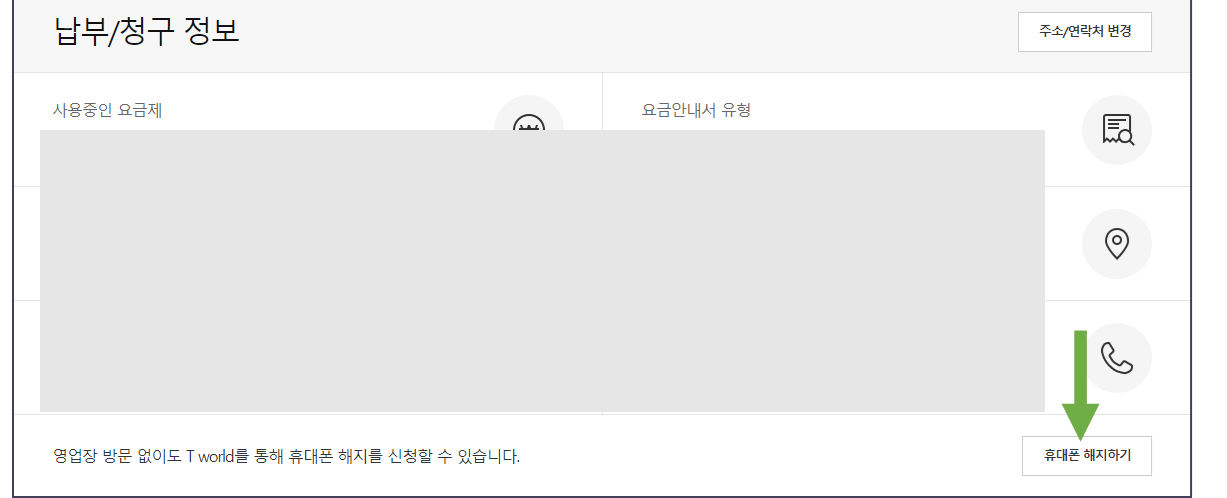 페이지를 쭉 내리면 납부 / 청구 정보 오른쪽 하단의 '해지하기'를 클릭한다.