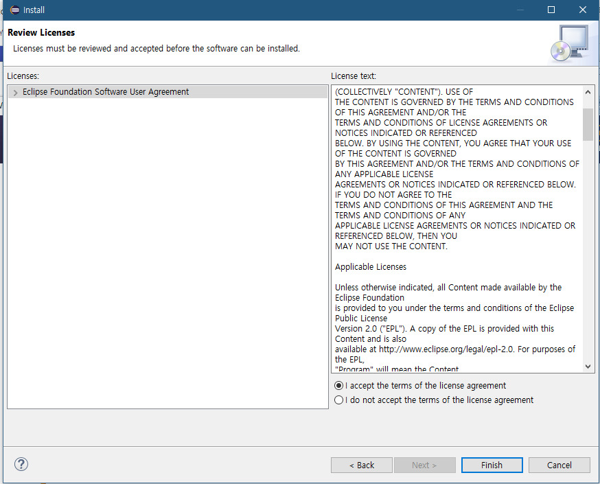 'I accept the terms of the license agreement'를 클릭하고 약관에 동의합니다.