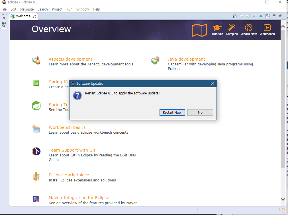 한국어팩이 다 설치되면 이클립스를 재시작합니다.