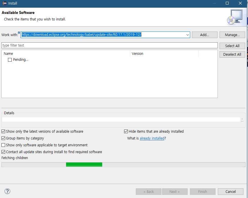 아래의 Babel Language Pack Update Site 에서 제일 최신 버전의 링크를 복사해둡니다.