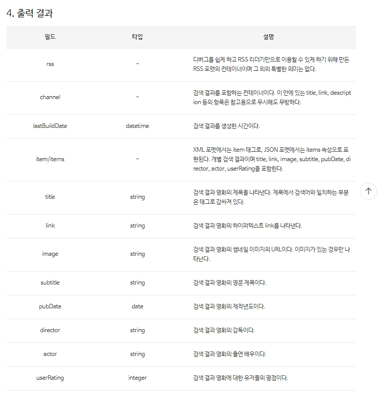 Movie 클래스의 데이터에 대하여 API 데이터가 다음과 같은 인덱스를 가지고 있으므로, 이에 따라 데이터를 객체에 담는 것이 필요합니다. 필드: title, link, image, subtitle, pubDate 등