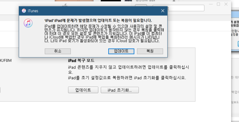 정상적으로 iPad가 연결되고 초기화 모드에 진입한 경우, iTunes에 알림이 뜬다.