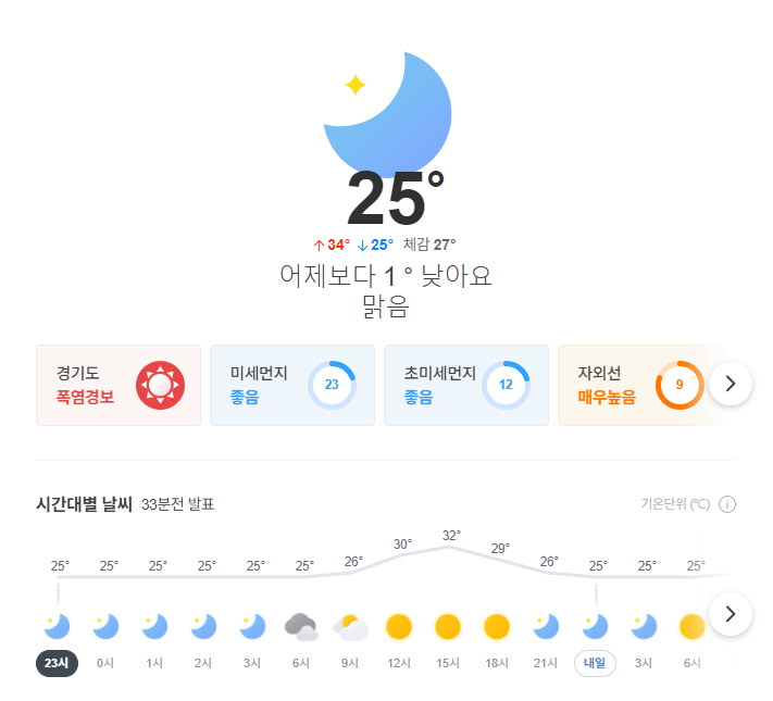 <p class="summary ">어제보다 <span class="summary_temperature">1</span> ° 낮아요<br> <span class="weather">맑음</span> <a href="#hourly" class="link_rainfall" role=“button”>시간당 강수량 <strong>0mm</strong></a> </p>