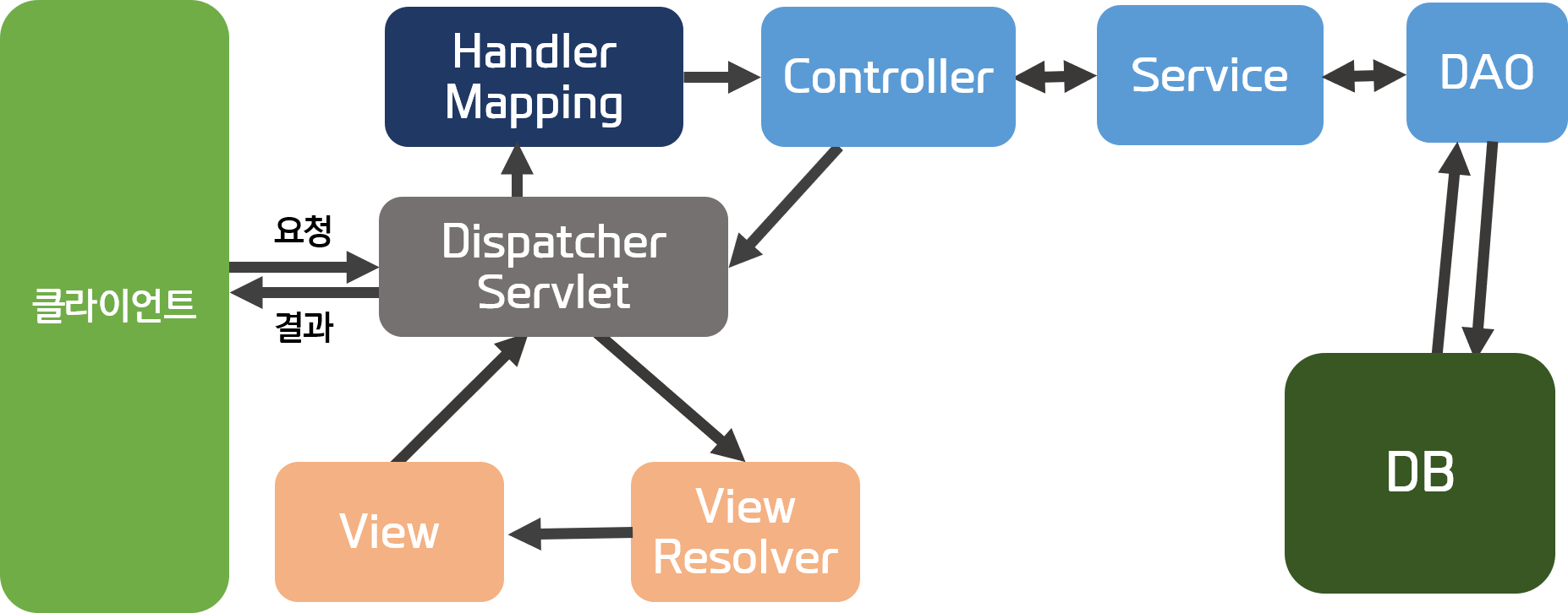 1) 클라이언트가 서버에 요청하면 DispatcherServlet(Front Controller)이 먼저 요청을 처리한다.