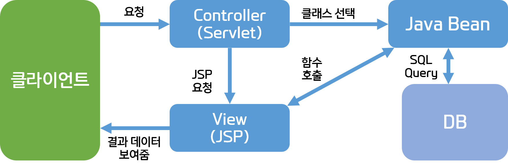 MVC1 는 클라이언트의 요청을 JSP가 받아 처리하는 구조입니다.