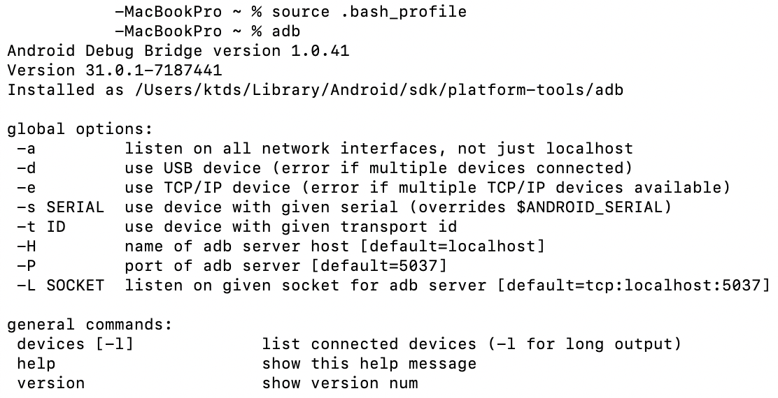 source .bash_profile 이 실행되지 않은 경우 간단하게 source .bash_profile 수행하여 adb를 정상적으로 구동할 수 있습니다.