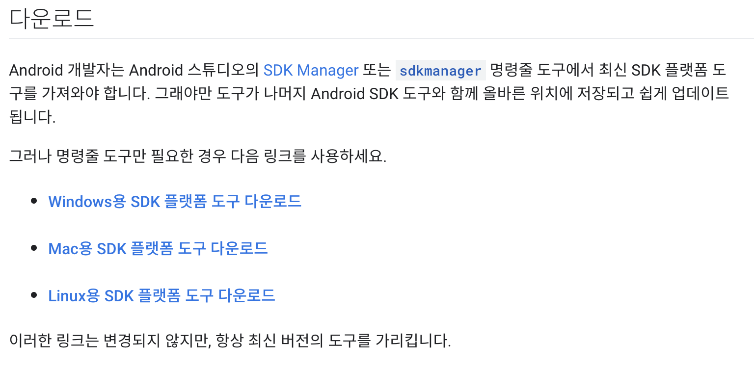 ADB는 아래 Android 공식 홈에서 다운로드할 수 있습니다. 각자의 PC 버전에 맞게 설치하면 됩니다.