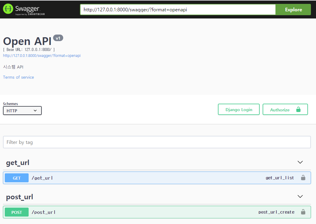 그리고 로컬 서버를 돌려 http://127.0.0.1:8000/swagger/ 에 접속하면 아래와 같은 화면이 뜹니다.