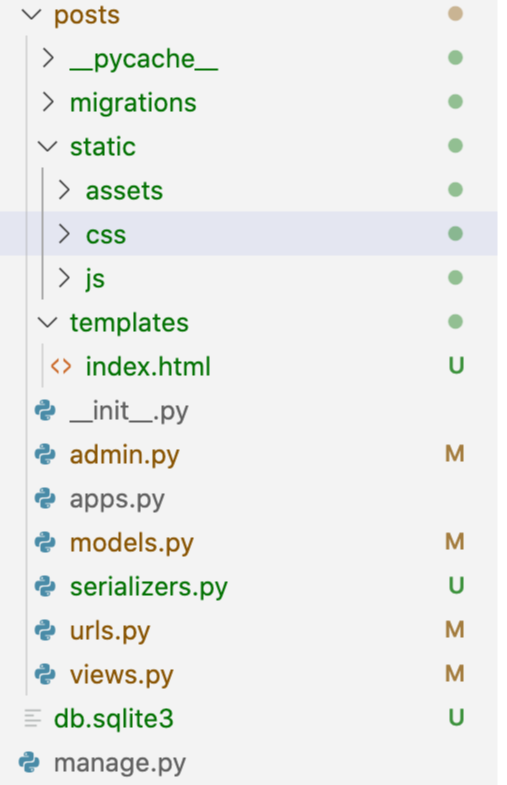 이제 MVT패턴의 'T'를 작성합니다. 앱(posts) 내 templates 폴더를 생성하여 index.html 파일을 만듭니다.