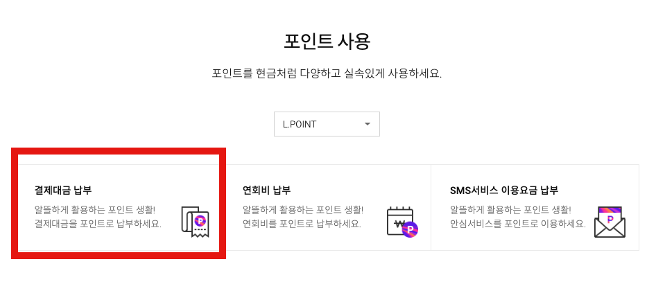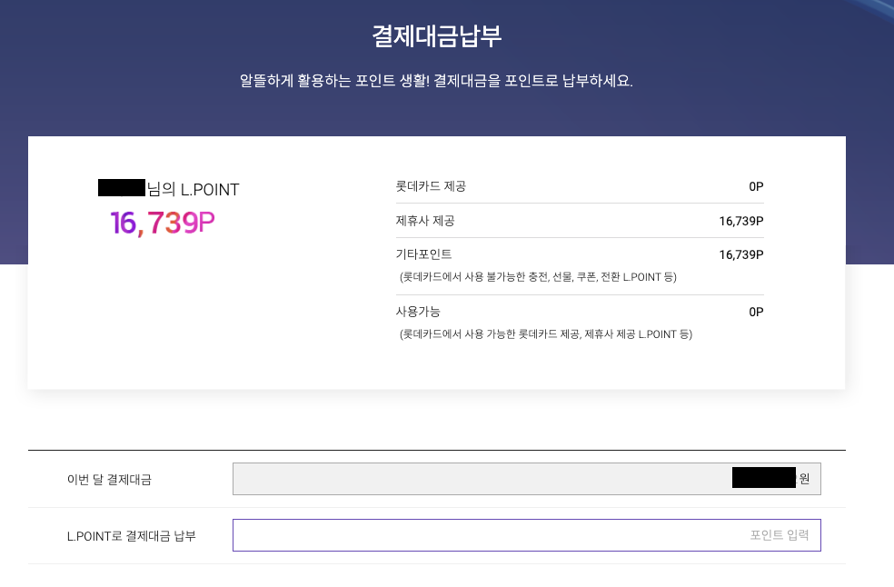 - 카드 결제일 당일에는 엘포인트로 카드 대금 납부가 불가합니다. (하루전까지 가능)