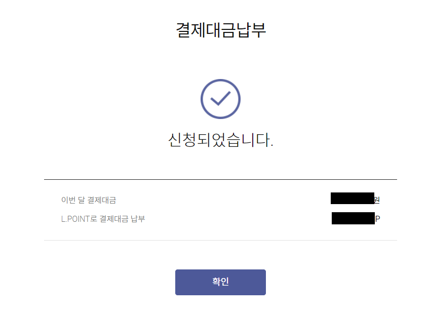 하단의 "결제 신청" 버튼 클릭 후, 신청 완료된 페이지가 뜬다면 정상적으로 카드 대금 납부된 것입니다 :D