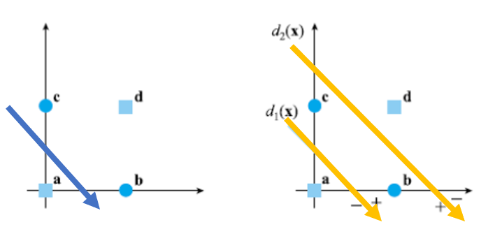 그러나 XOR 게이트를 x와 y의 좌표평면에 표현하면 아래의 왼쪽 사진과 같다.