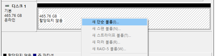 제 외장하드를 실수로 포맷해서, 다시 할당하려고 해보았지만 새 단순 볼륨이 만들어지지 않았습니다.